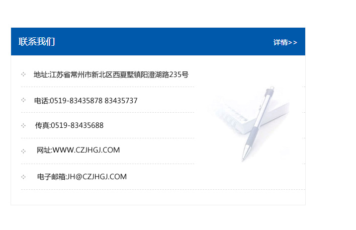 地址:常州市新北區友邦商務大廈1幢16、17層  電話:0519-85101652  傳真:0519-85112595  郵編:213022  網址:www.cz-jiayue_cn.hbhuafengyuan.com  郵箱:xiajifengaa@163.com